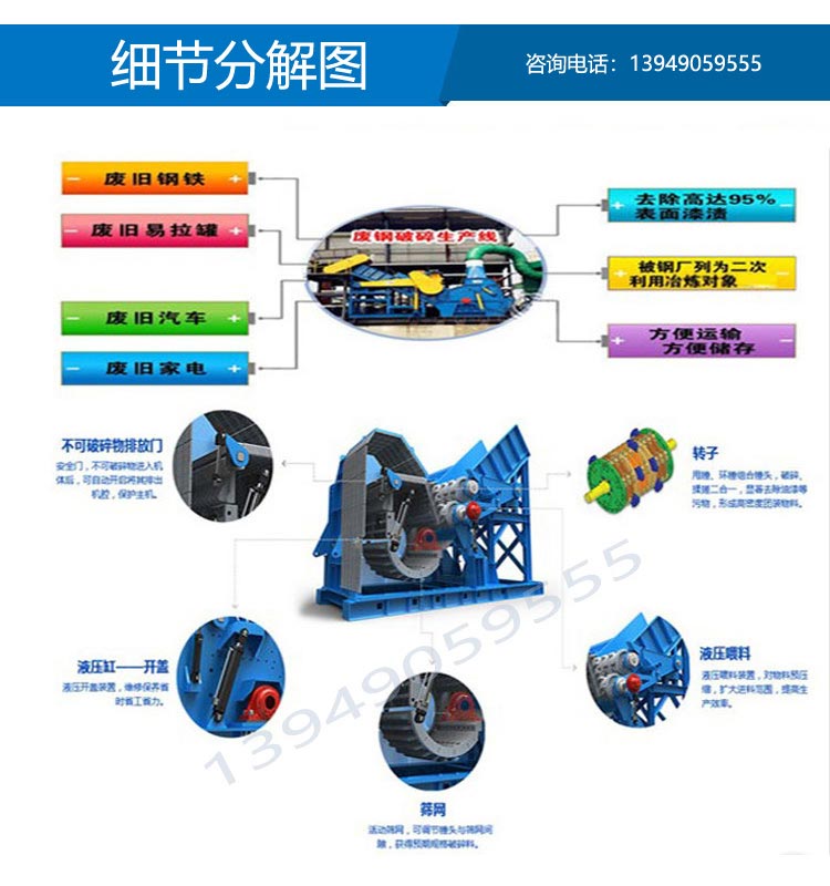 廢鋼破碎機,廢鋼破碎機生產線: 廢鋼破碎機 廢鋼破碎機視頻: 廢鋼破碎機,廢鋼破碎機生產線用于加工報廢汽車車體、馬口鐵類、舊家電、自行車、舊冰箱、彩鋼瓦、空罐等下等廢料使之成為上級的制鋼原...